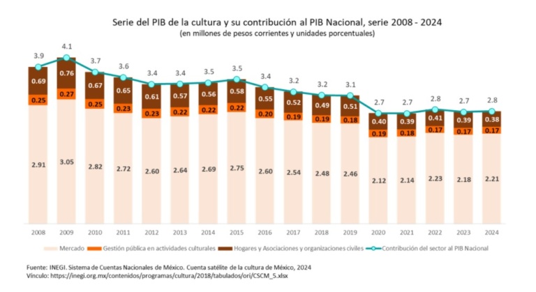 Ni con eso se replantea el federalismo y la fantasmagórica soberanía de las entidades. Visto con frialdad, la trayectoria de la Secretaría de Cultura tiene un alcance insuficiente en el suministro de dineros a la vida cultural de la nación. Si llevamos la lectura a otro apartado de la Cuenta Satélite, el de la estructura porcentual del PIB por bienes y servicios, la cifra, aunque diferente en su sustrato conceptual es colindante con fines ilustrativos. Al tomar la muestra de 2016 al 2024 (dado que el 2025 lo sabremos a finales de noviembre de este año) el Inegi suma en uno de los componentes lo aportado por el gobierno y la organización civil fijándolo en 408 mil millones de pesos.